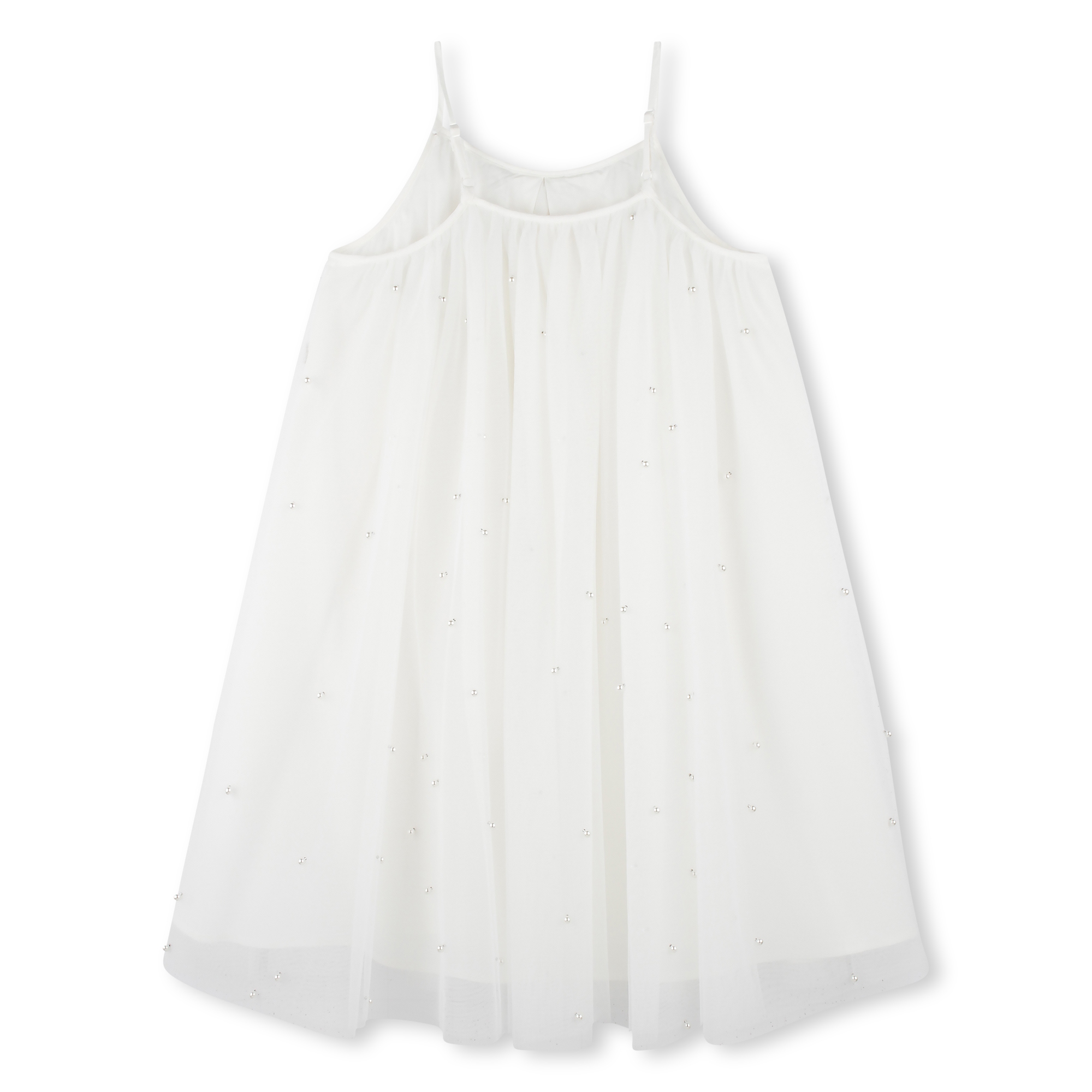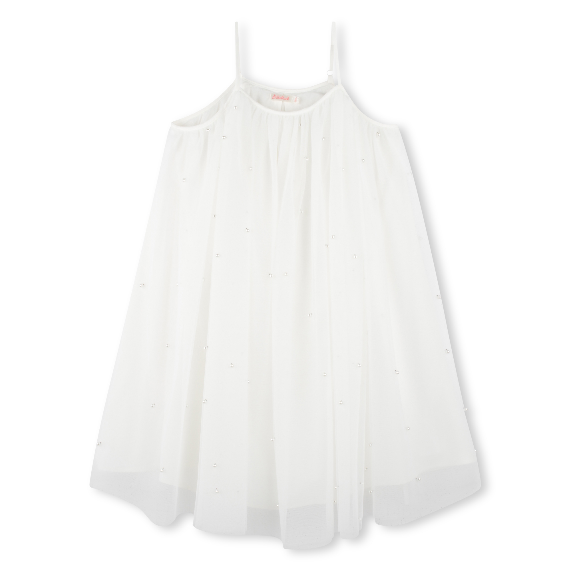This Billieblush ivory tulle ceremony dress is ideal for any special or celebration. The sleek design includes adjustable spaghetti straps and multiple layers of soft tulle adorned with 3D pearls for dramatic effect. It features a full skirt and is fully lined enhance the fabric’s flow.