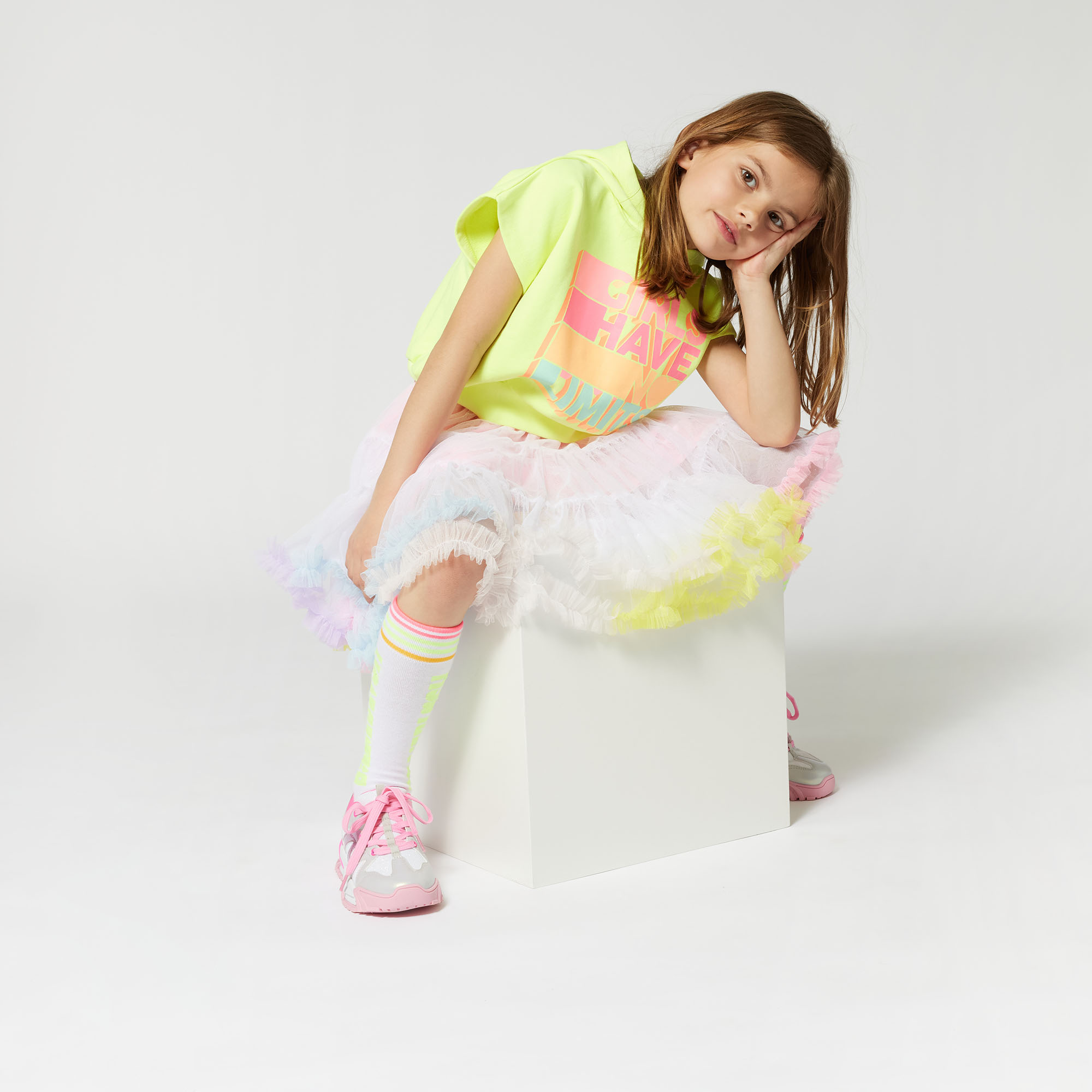 Introduce an element of fun with this pink multicolored glitter mesh tutu skirt. This full skirt features layers of ruffled tulle and is fully lined with a glitter elasticated waistband for comfort. It offers excellent twirl factor for all the little twirly girls.