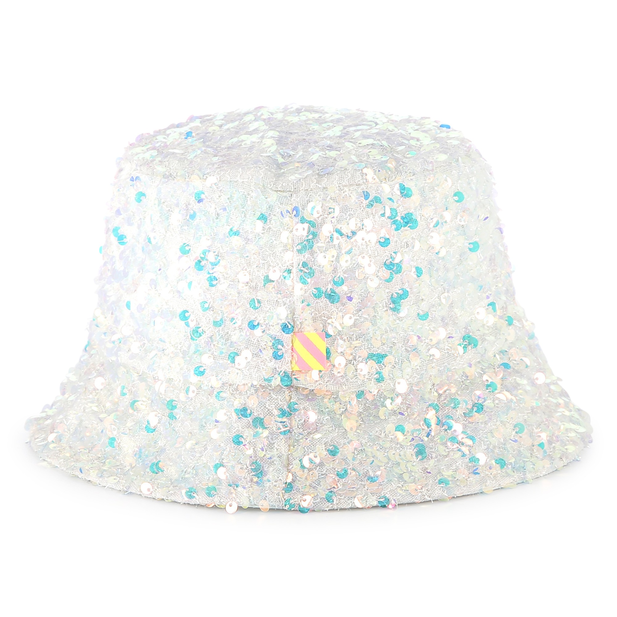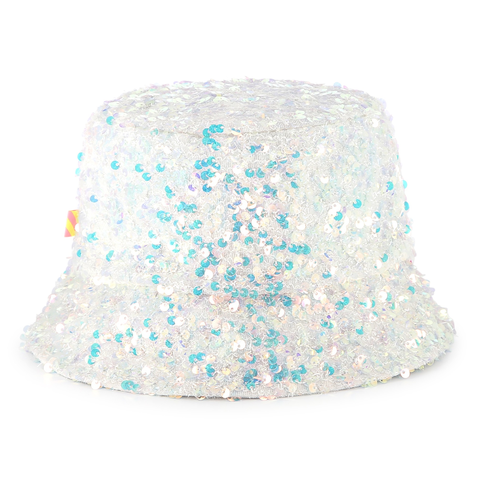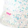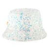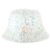 The white sequin embroidered bucket hat is the ideal accessory to complete any ensemble. The exterior iridescent sequins and a glittered silicone logo, while the interior is made of comfortable twill cotton. It is designed for all stylish fashion enthusiasts.