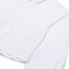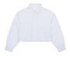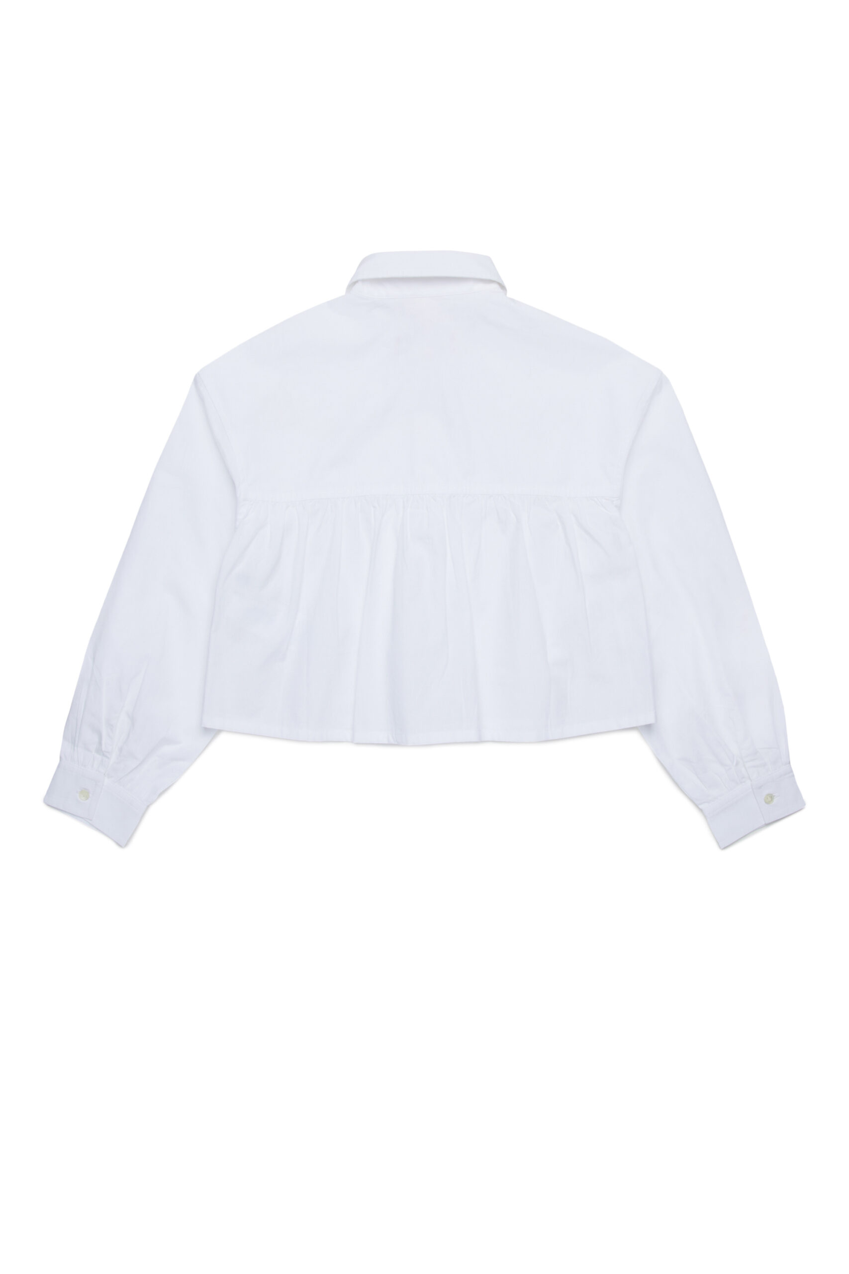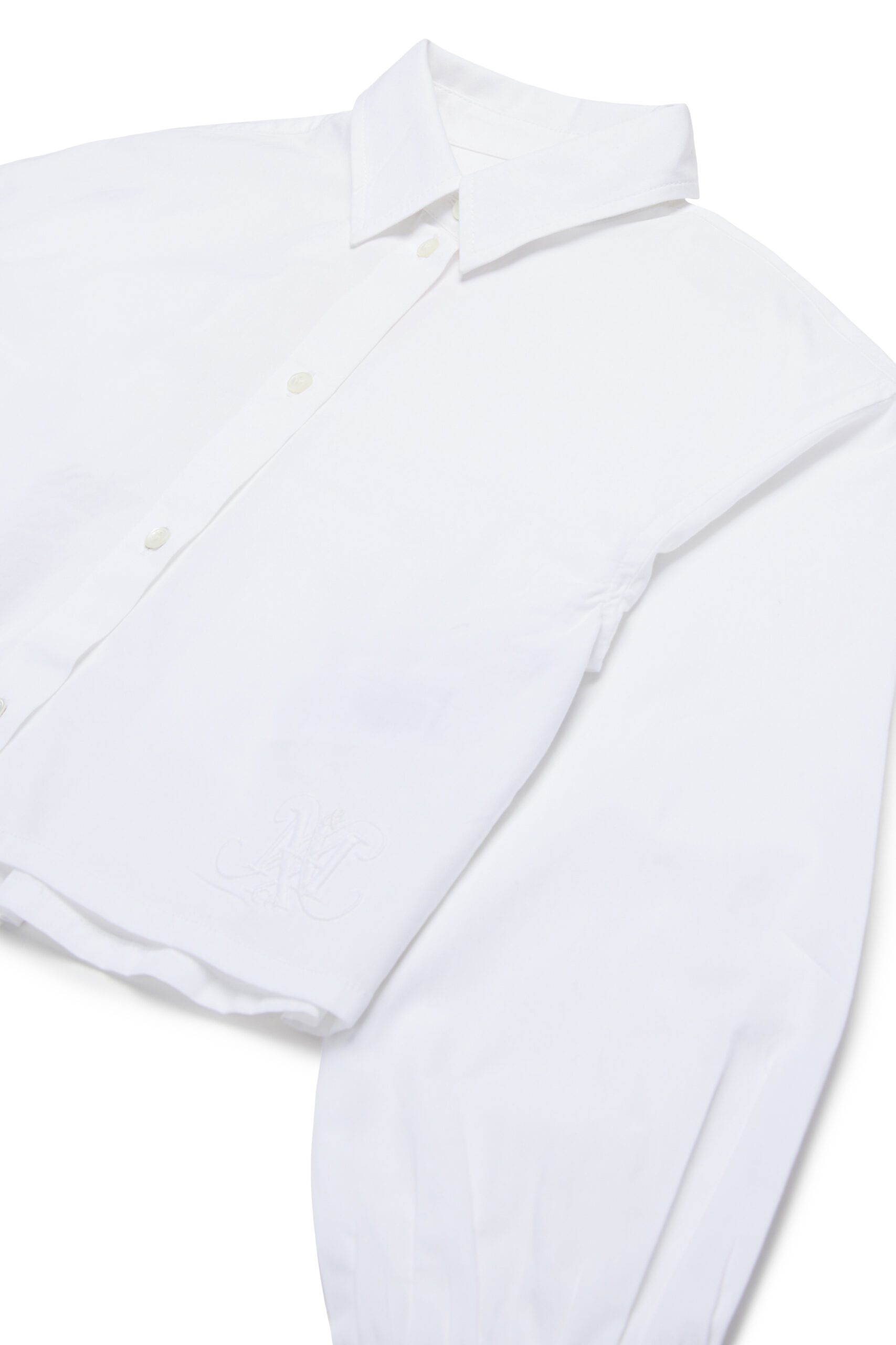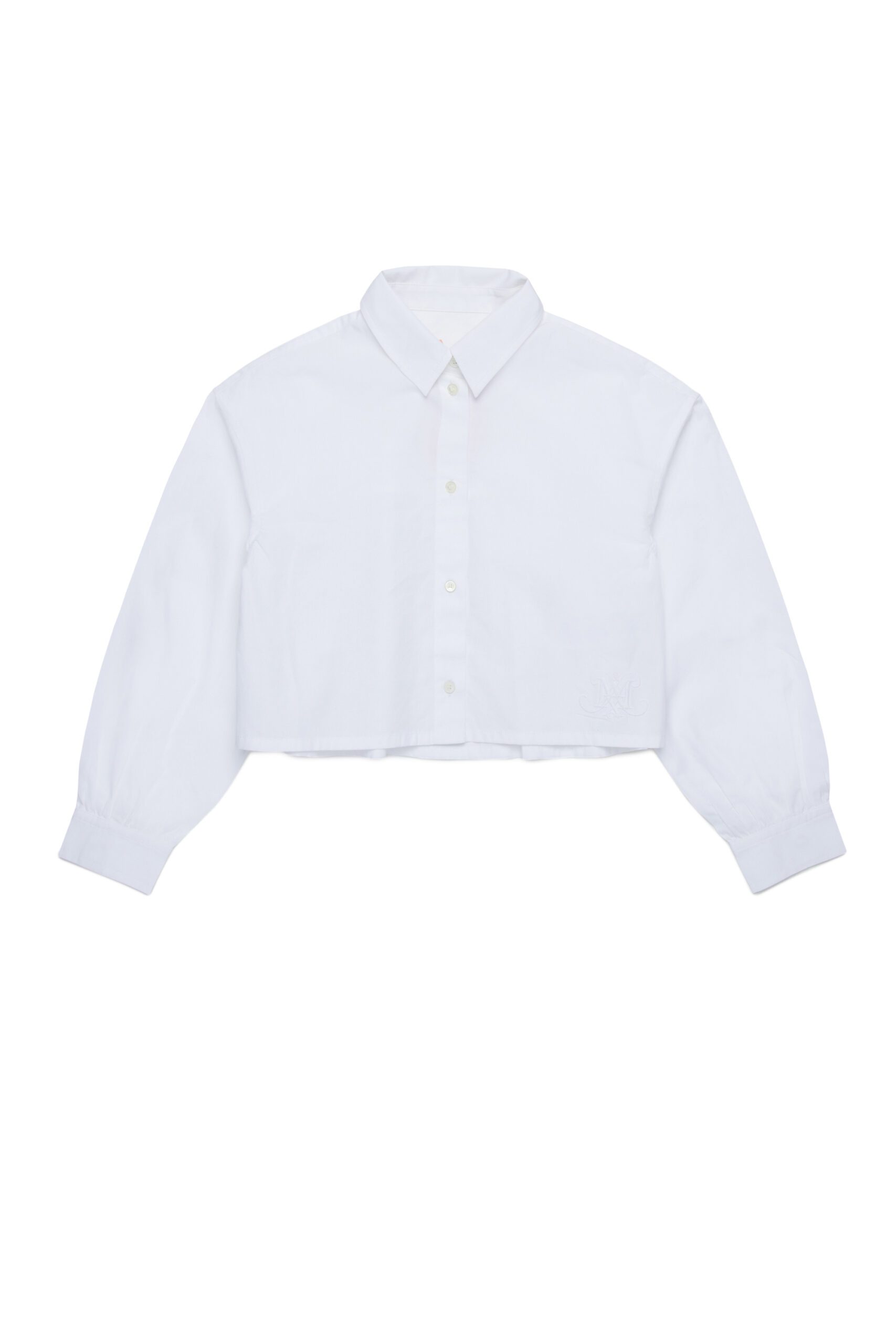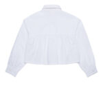 The Camicio Shirt Blouse features a collared, button-front design with bubble sleeves and a gathered back detail. It’s made to be worn untucked, showcasing an embroidered monogram logo above the front hemline. The balloon sleeves are finished with a single button closure.