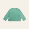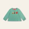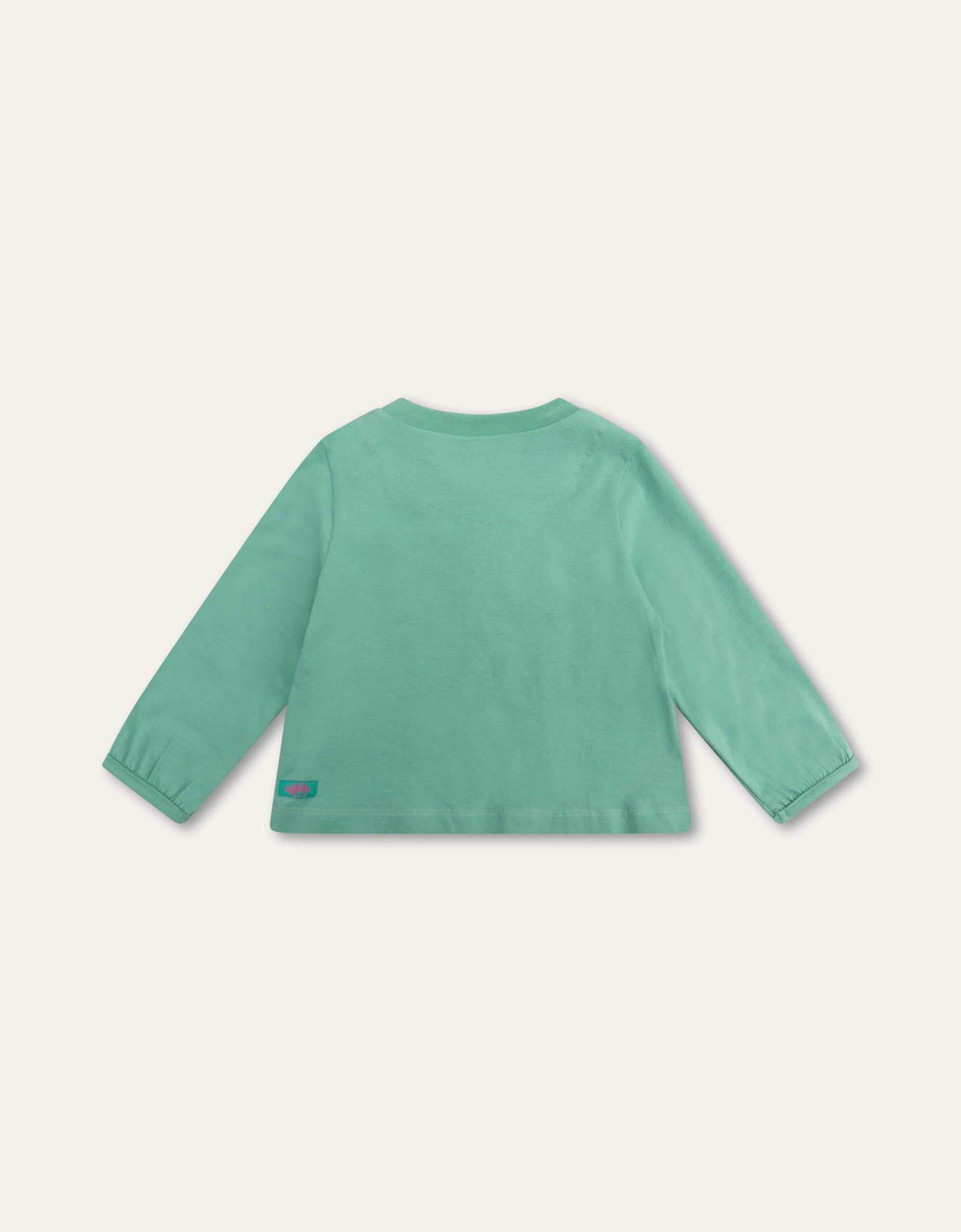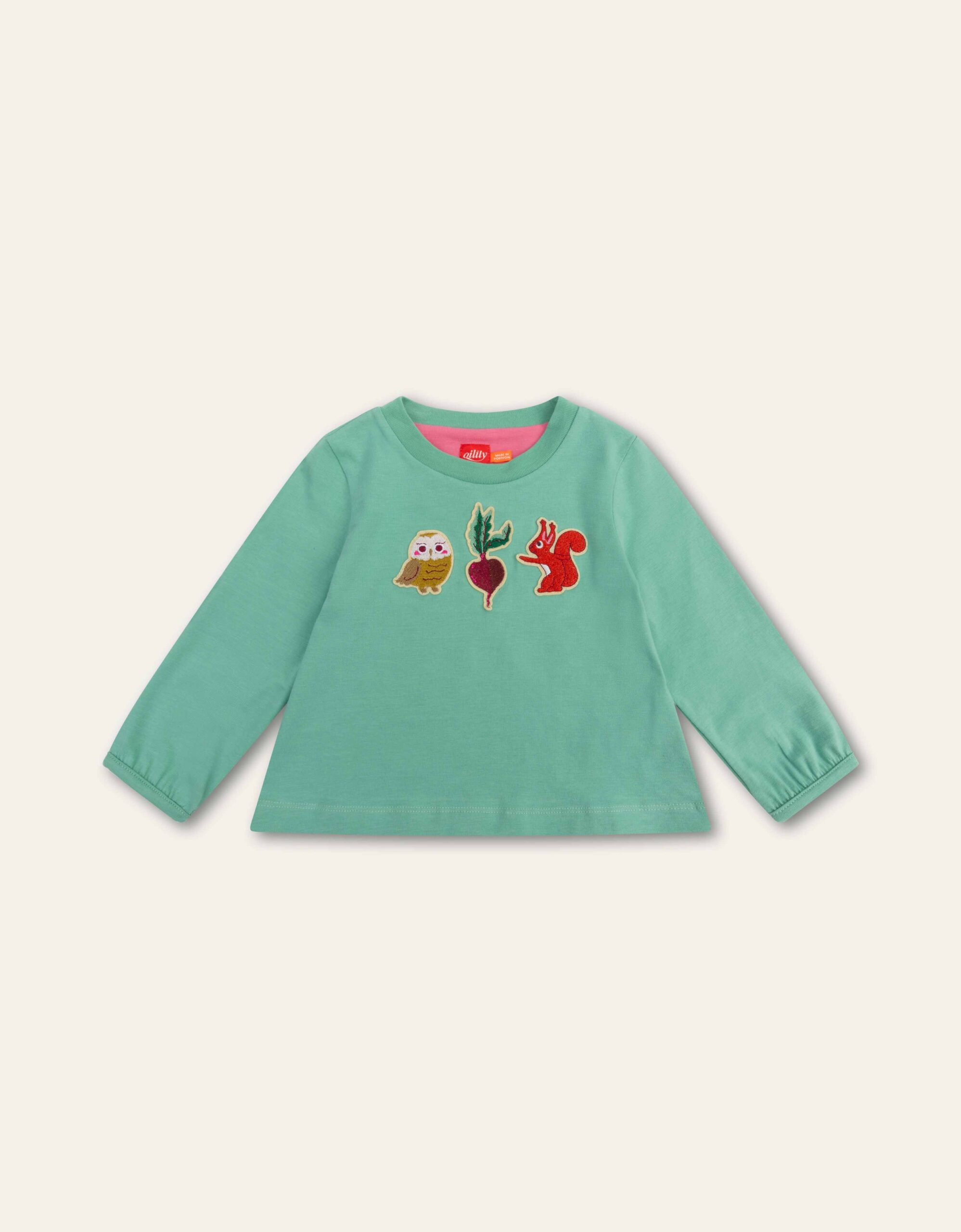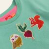 The teal Tempo long sleeve baby t-shirt is made from soft, stretchable organic cotton.  It features charming, embroidered patches of animals and vegetables across the chest.  The loose-fitting sleeves with gathered wrists add a touch of elegance to the design