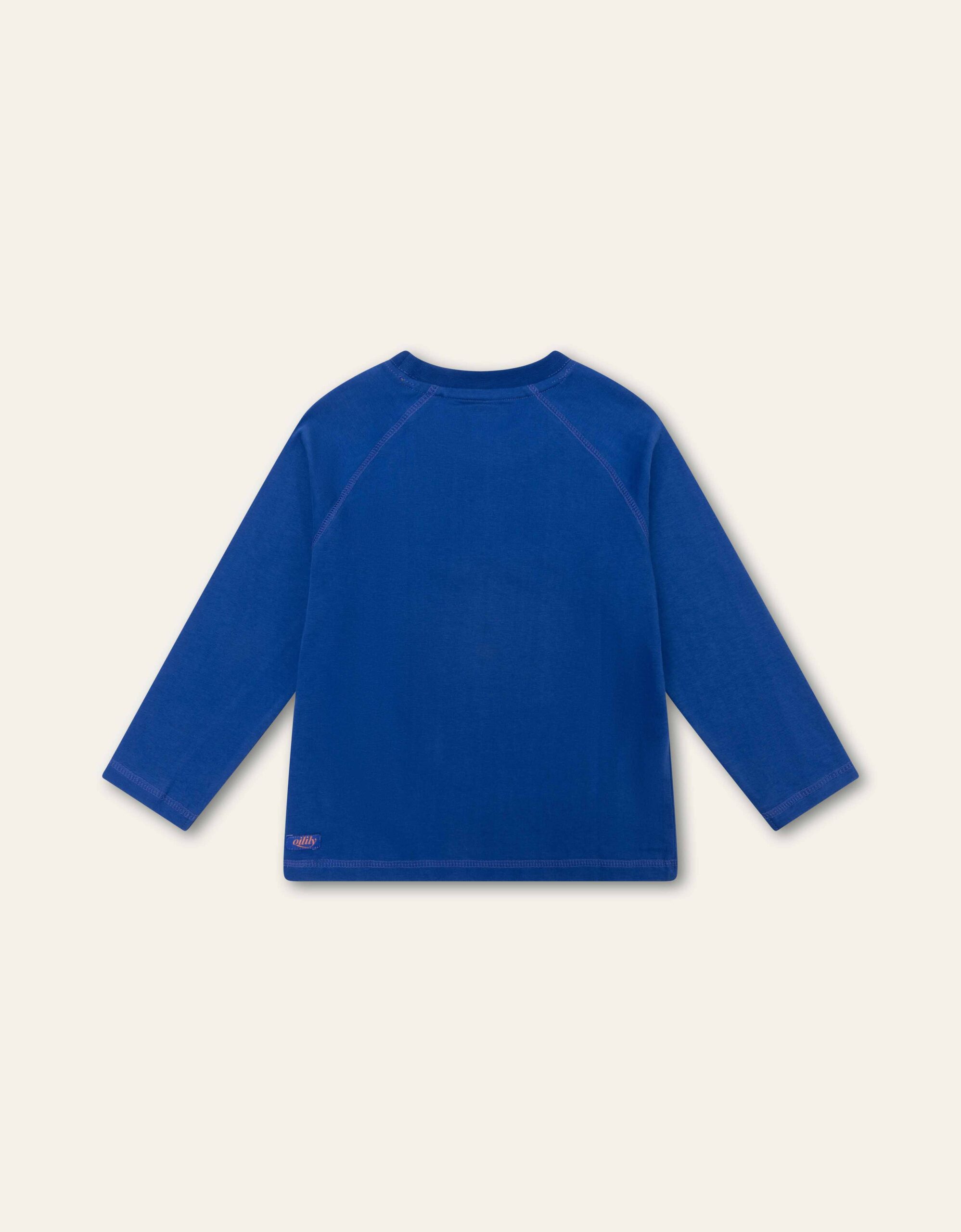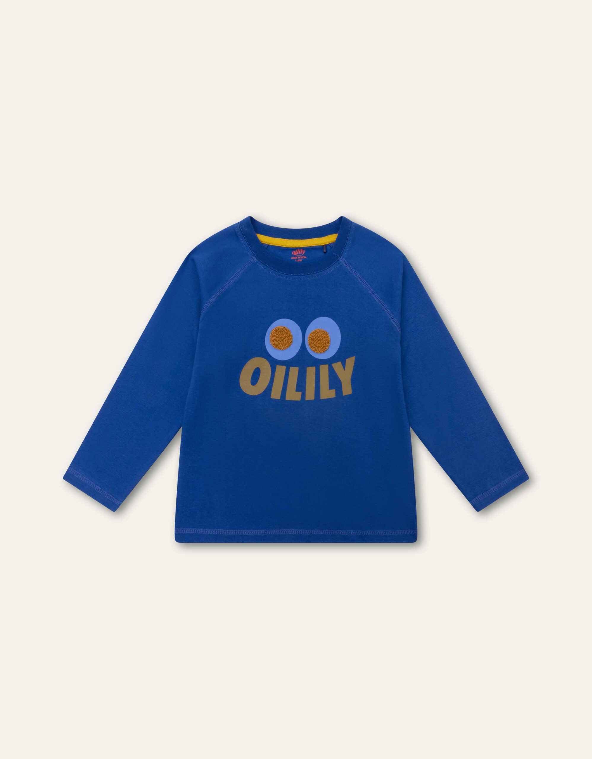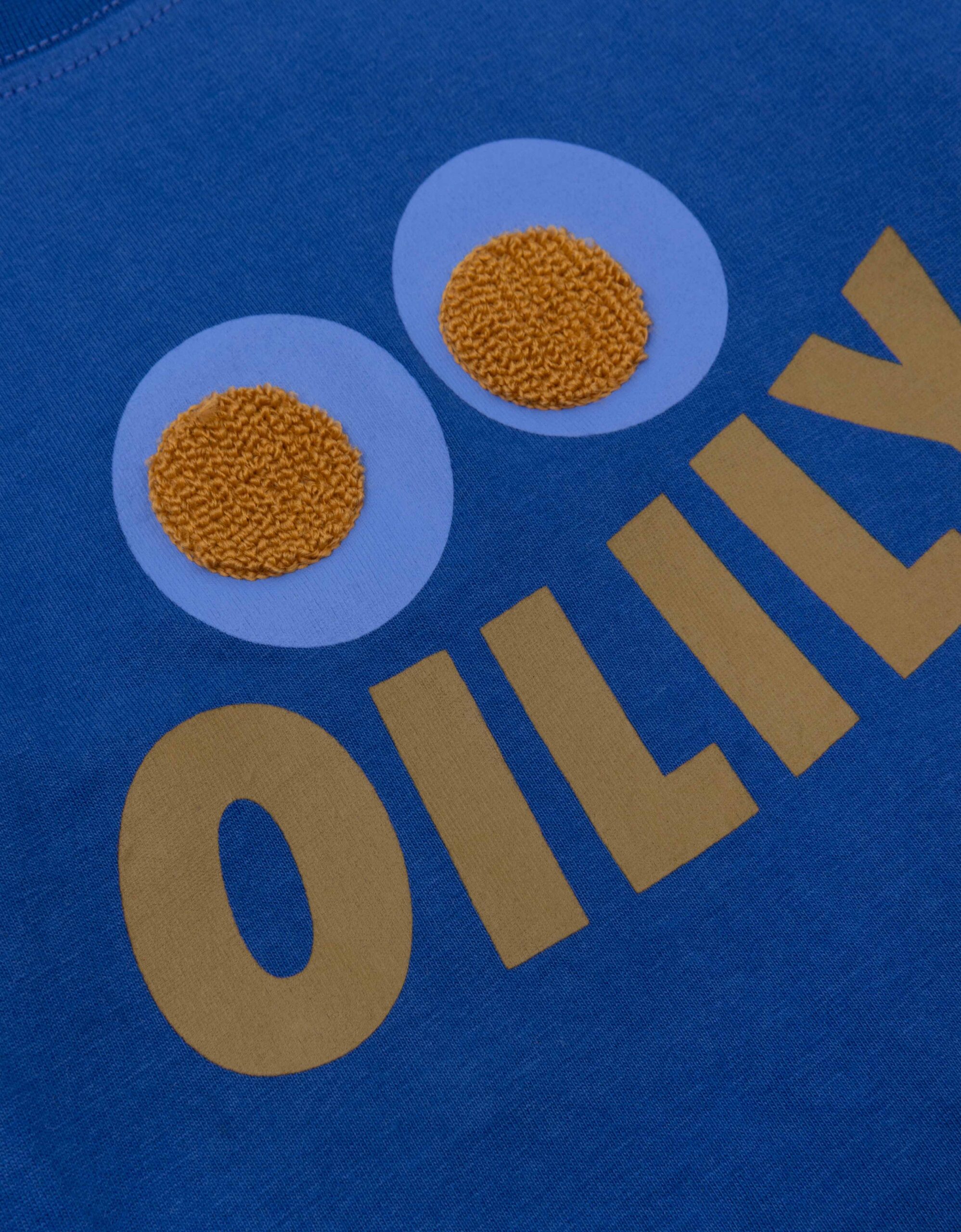 The Twan royal blue long-sleeve cotton tee features a playful smiley face with large eyes, accented by 3D embroidered rug art centers and the OILILY logo smile. This charming tee is bound to become a wardrobe favorite.