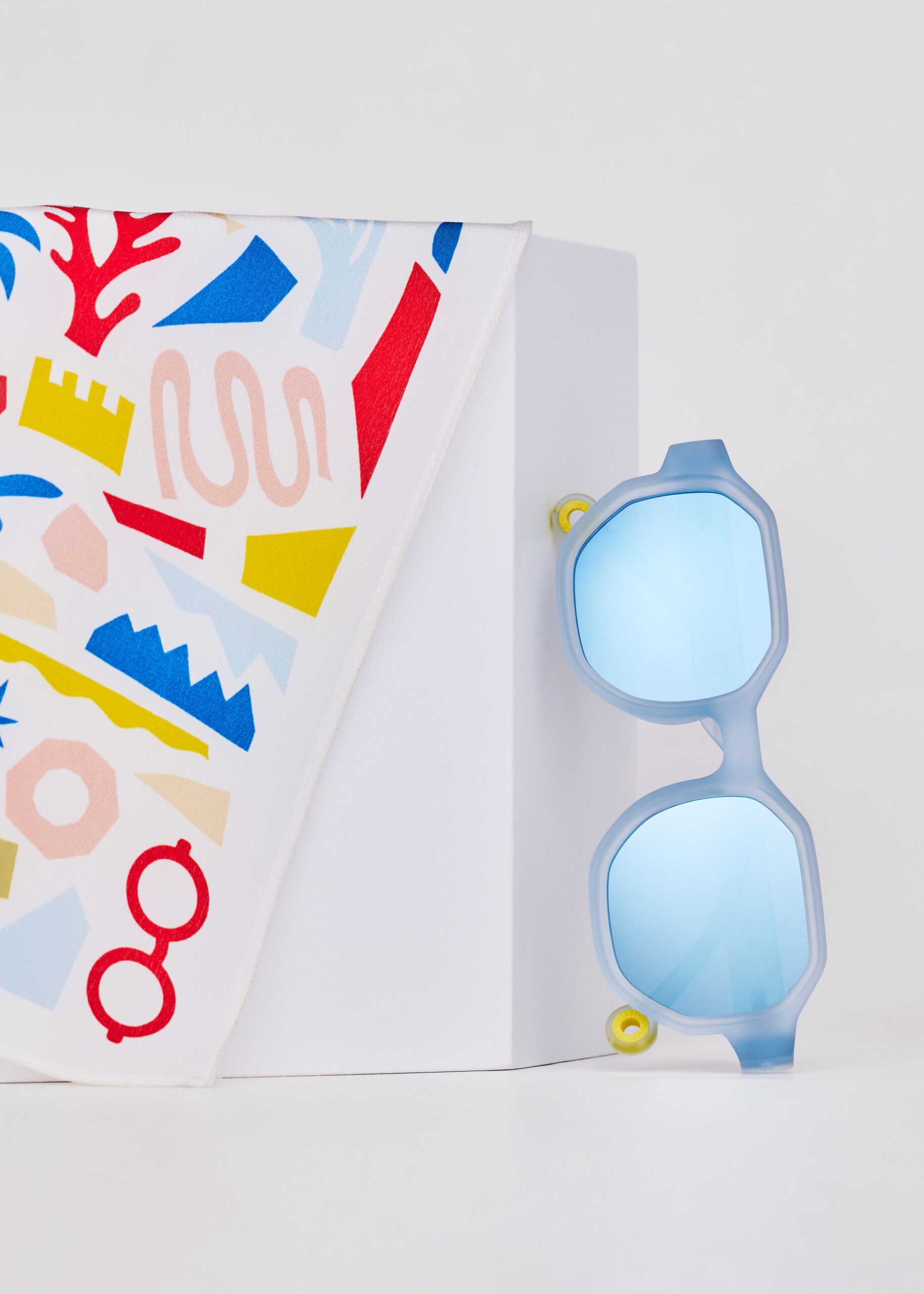 These sky-blue polarized sunglasses, inspired by Henri Matisse’s paper cutouts, showcase a bold modern frame and vibrant colors. Paired with a unique colorful scarf, they add a pop of contemporary sophistication to your daily style.