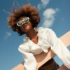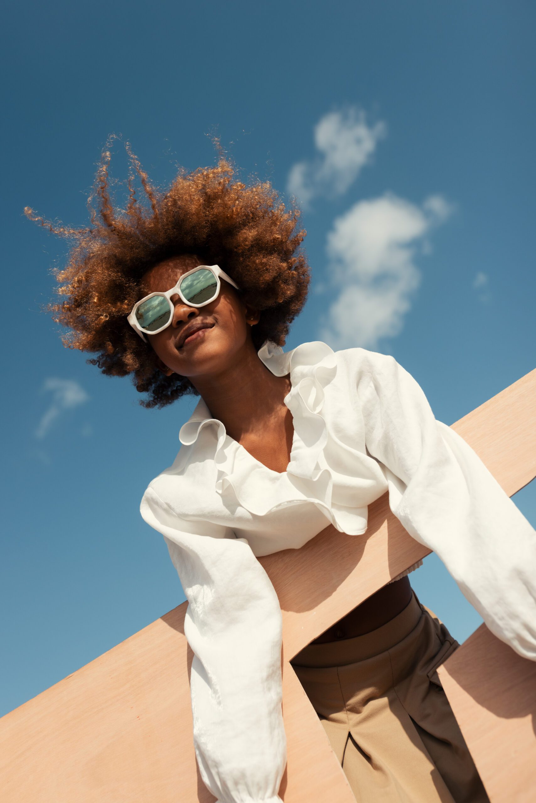 These sky blue polarized sunglasses, inspired by Henri Matisse’s paper cutouts, showcase a bold modern frame and vibrant colors.  Paired with a unique colorful scarf, they add a pop of contemporary sophistication to your daily style.