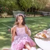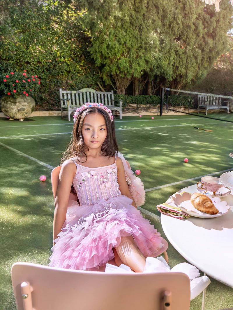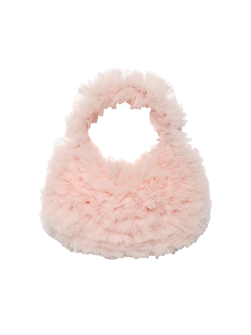 The almond-colored Arcadia Purse exudes old-time glamour!  The handcrafted, hand-decorated purse boasts soft tufts of scrunched tulle with a wide handle adorned with rhinestones, pearls, and sequins.  There is a snap closure that will keep all of your belongings safe during highly glamorous twirl sessions.