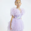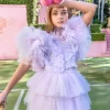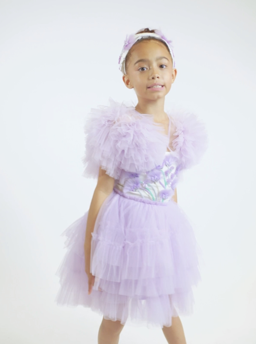 This gorgeous pastel lilac Flower Bomb Shrug is a bold statement piece.  It is crafted of large soft clustered flowers with sequin centers that cascade from the front to the back.  This multilayered shrug is the perfect topper to the Lavendar Lounge Tutu Dress or any ensemble of your choosing.