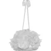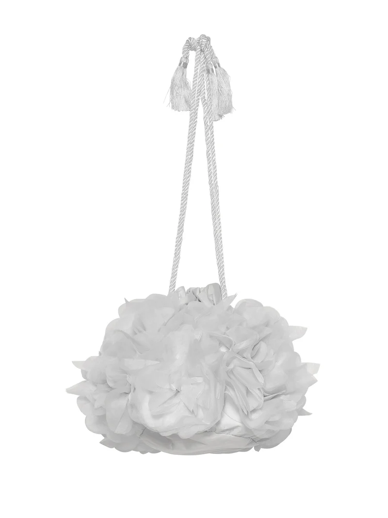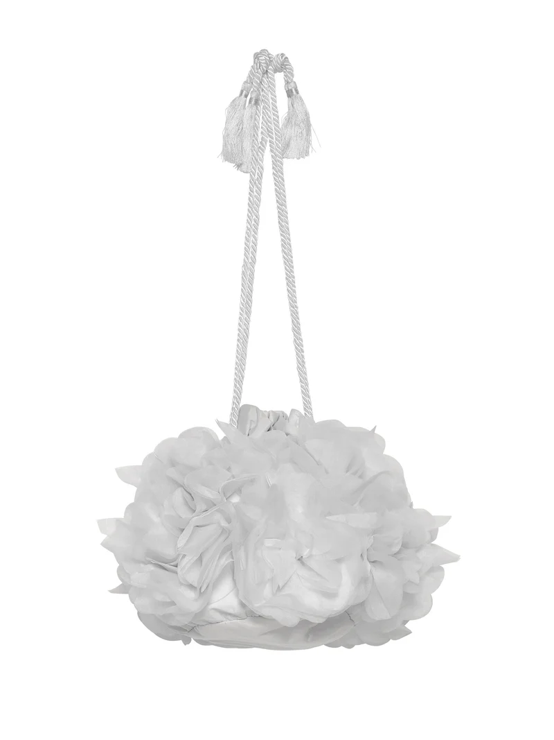 The Peony Petal purse is a blooming vision of loveliness!  This milk colored purse is handcrafted and adorned with elegant satin tulle peonies.  The peonies are embellished with shimmering rhinestone centers that add a touch of luxury.  The purse is completed with a rope drawstring cord, finished with glamorous tassels.